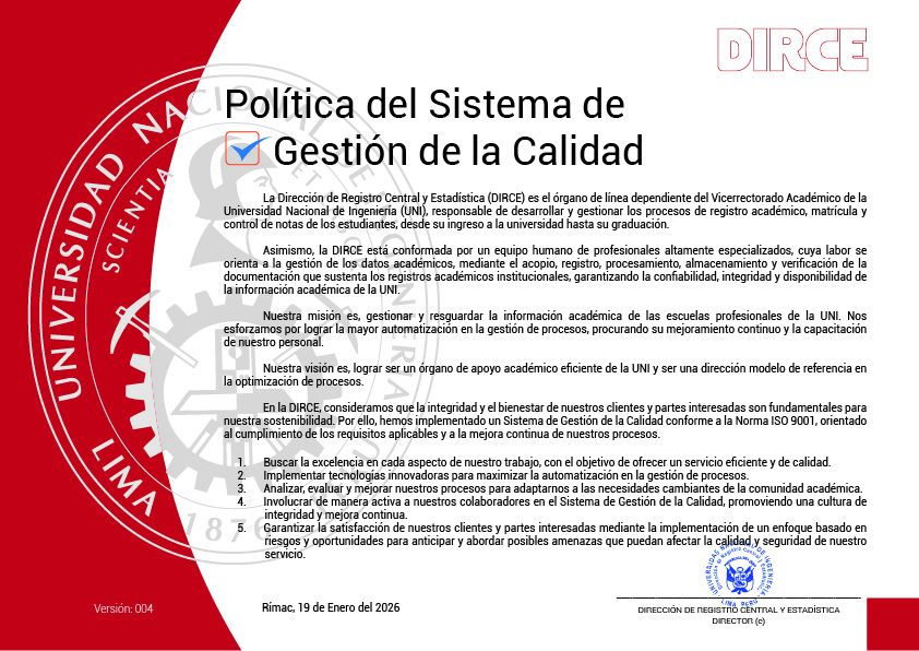 Somos la Dirección de Registro Central y Estadística (DIRCE), un gran equipo humano de profesionales altamente especializados, cuya labor es gestionar los datos académicos a través del acopio, registro, procesamiento, almacenamiento y verificación de la documentación que sustenten los registros académicos de la Universidad Nacional de Ingeniería (UNI).
